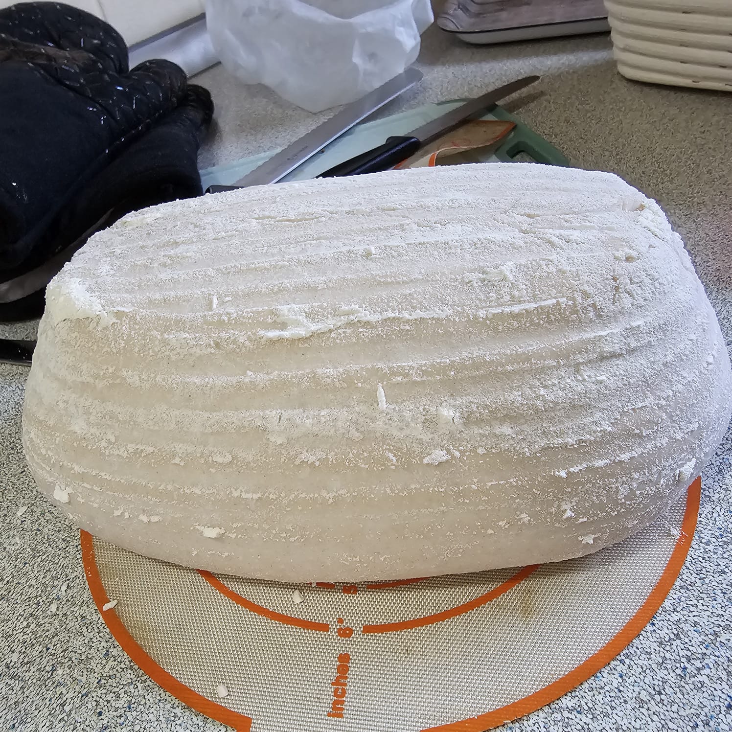 Den Teig auf bemehlter Arbeitsfläche rund wirken und im Gärkorb oder Schüssel mit bemehlten Geschirrtuch für 60-90 Minuten reifen lassen.