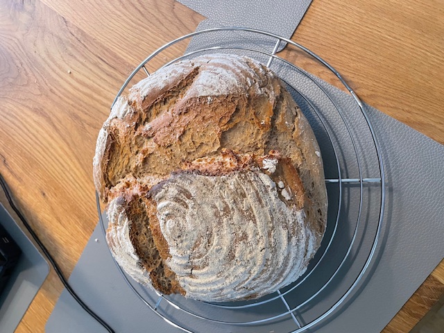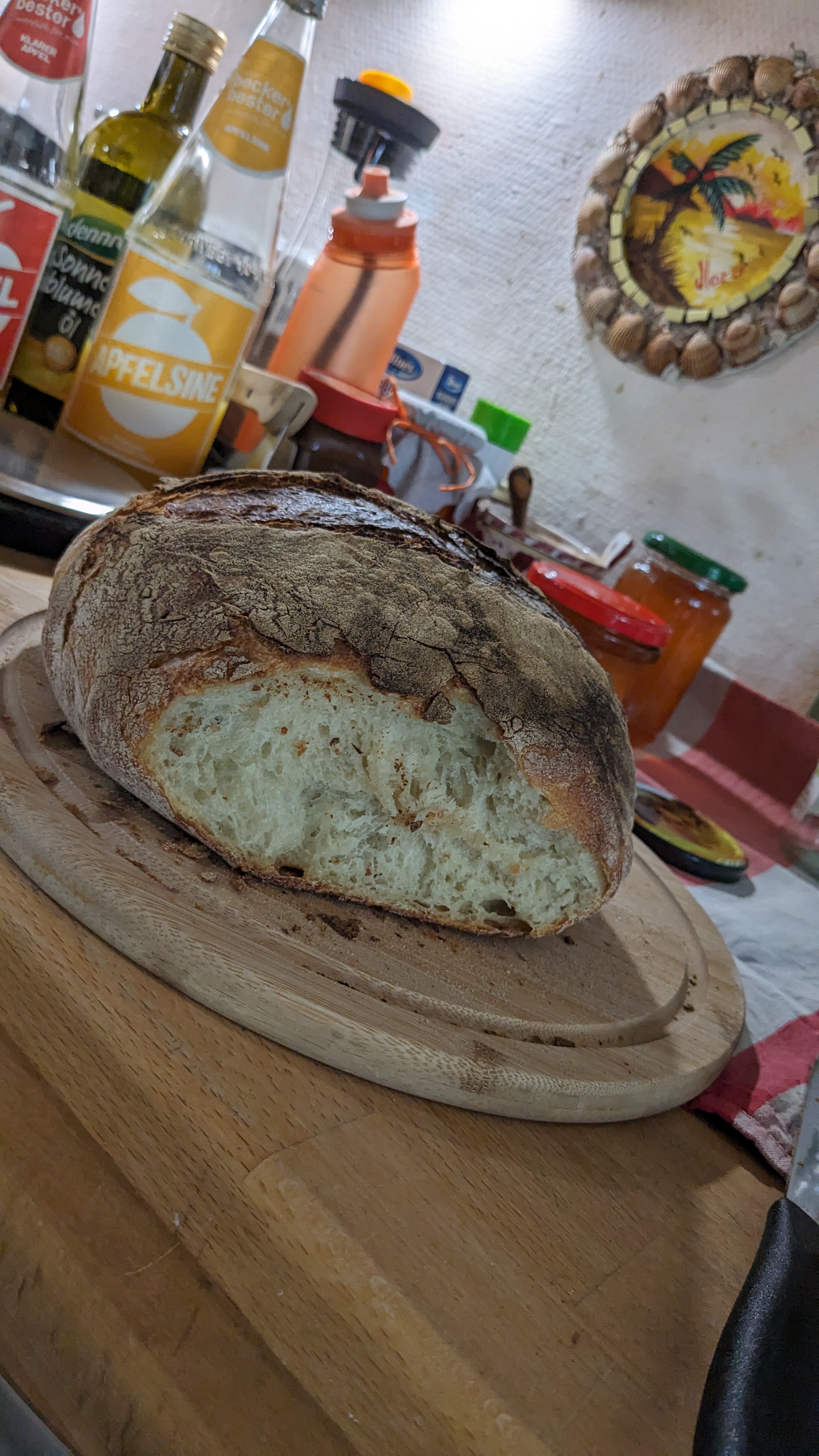 Find die finale Backtemperatur von 250 Grad Zuviel. Das Brot ist leicht angebrannt und die Kruste ist extrem trocken. Falls ich das nochmal nachmache, dann werd ich es bei 230 Grad fertig backen.