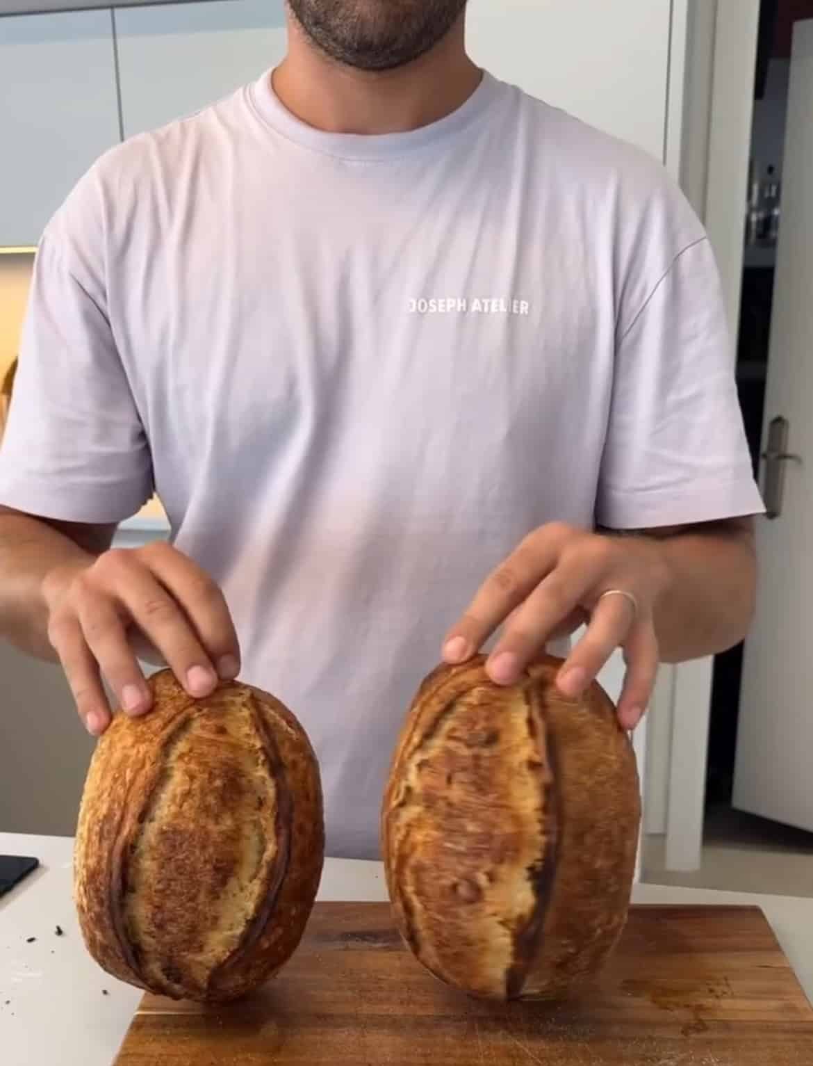 Ofen auf 250°C O/U-Hitze mit einem gusseisernen Topf vorheizen (alternativ mit Backstein und Dampfschüssel). Die Brote in den Topf geben und Deckel schließen (Bread Pan: mit 2 Eiswürfeln; Backstein: stark beschwaden). Nach 15 Minuten den Deckel abnehmen bzw. Dampf ablassen, auf 230°C Umluft stellen und 30 Minuten fertig backen.