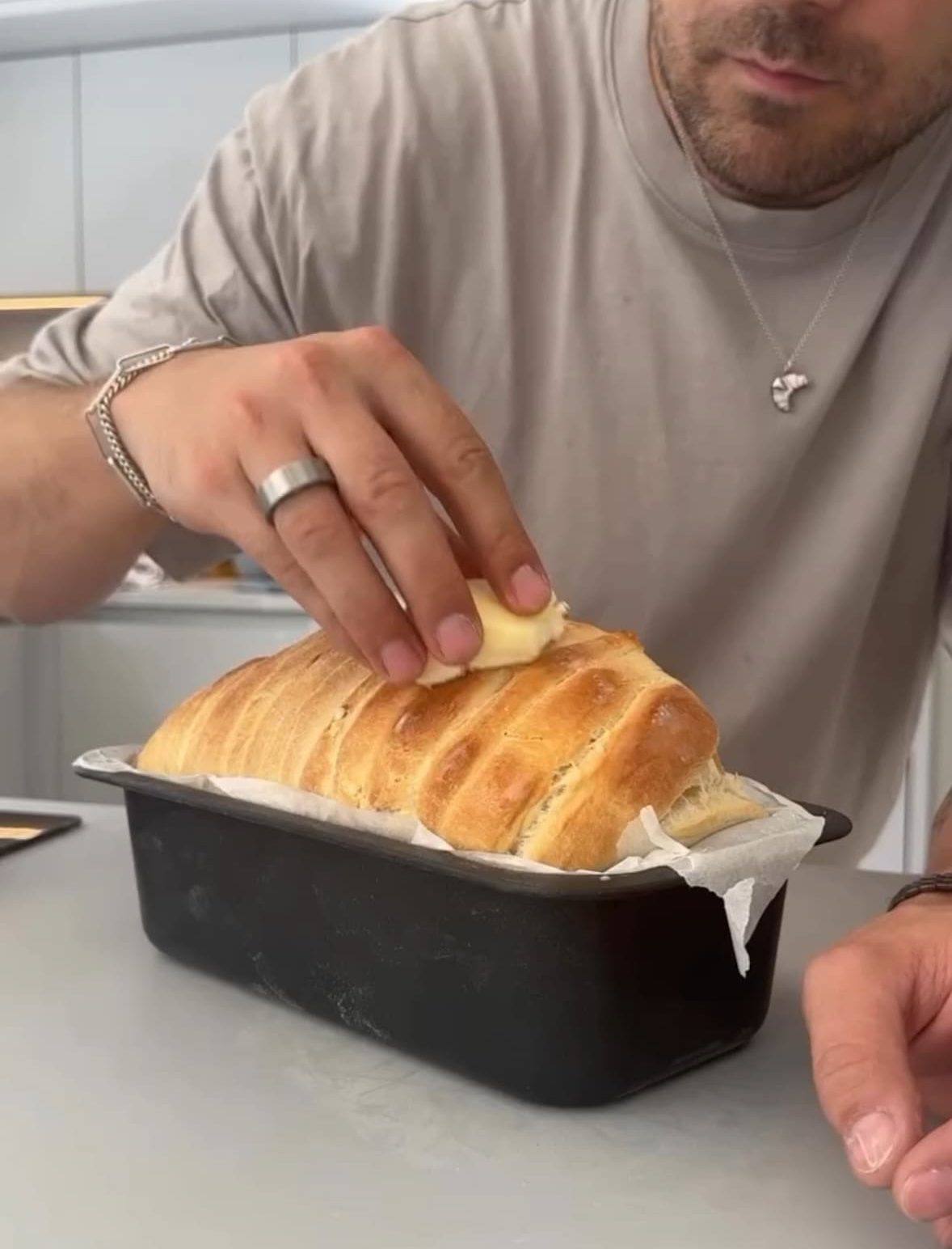 Lasse das Shokupan auf einem Gitter auskühlen. Bestreiche die Kruste mit etwas Butter, um ihr einen seidigen Glanz zu verleihen.
